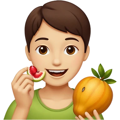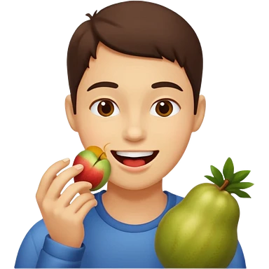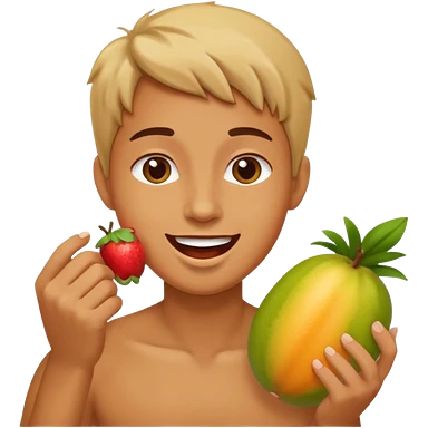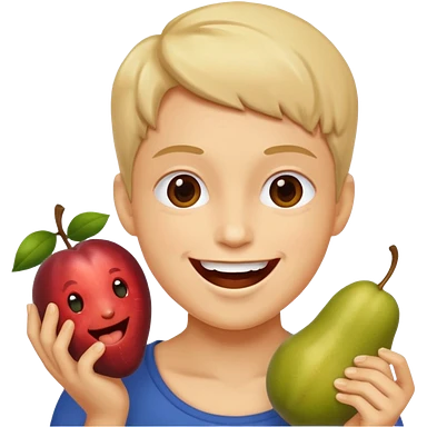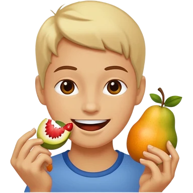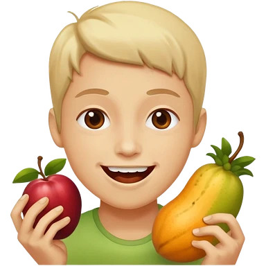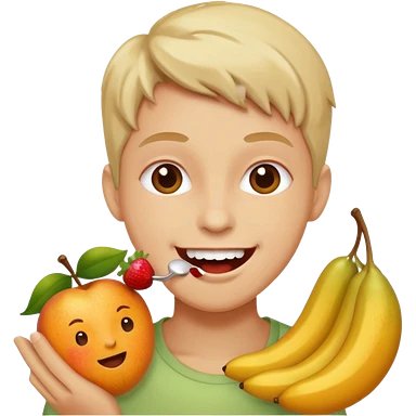 Bold baby boy eating fruits with a british shorthair cat emoji