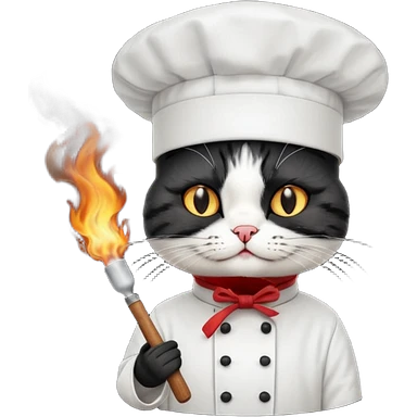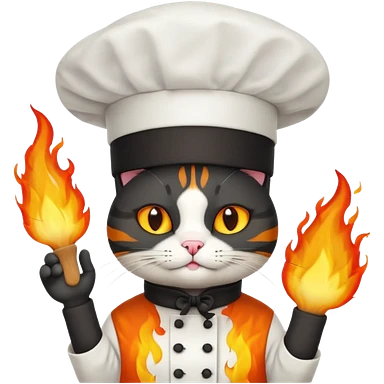 extra black chef cat wearing a tall white chef hat, burning hat emoji