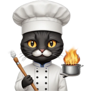 black chef cat wearing a tall white chef hat, burning hat emoji