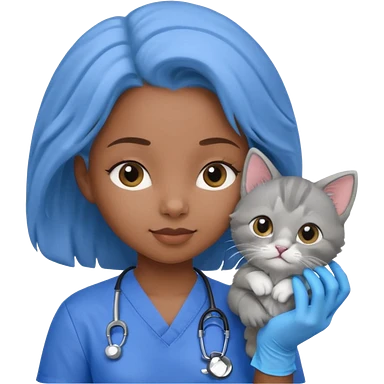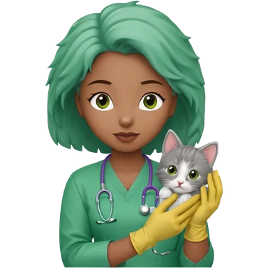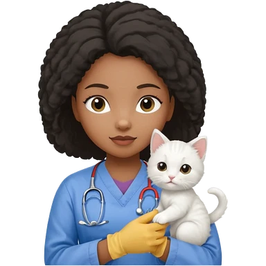 Young black female vet – scrubs, gloves, examining kitten. emoji