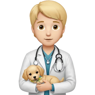 Young male vet – white coat, stethoscope, holding puppy. emoji