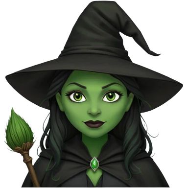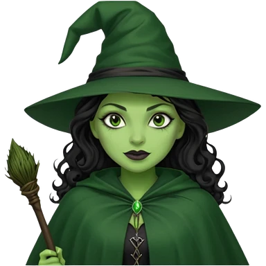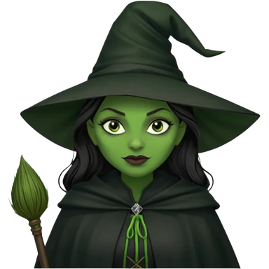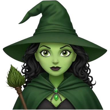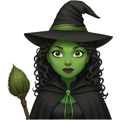 elphaba wicked witch with broom close up, evil dark curly long dark hair, green skin, thick green lips, cheekbones, smirk evil menacing cythia erivo dark aesthetic black hat cloak black broom emoji