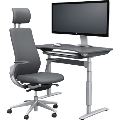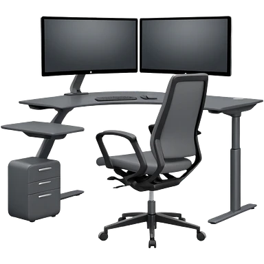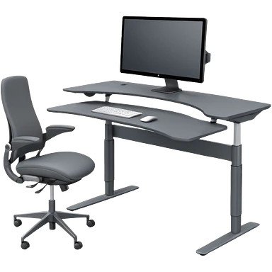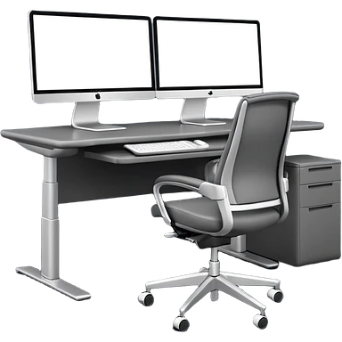 3D minimal icon of a wide height-adjustable motion desk with dual monitors and a modern ergonomic office chair, with a subtle accent in #FF3D00. Clean and high-end style. emoji