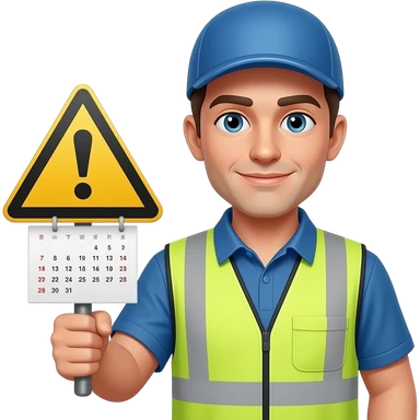 ein müllmann, der ein warmschild mit einem kalender hälöt emoji