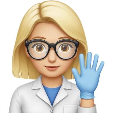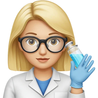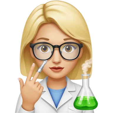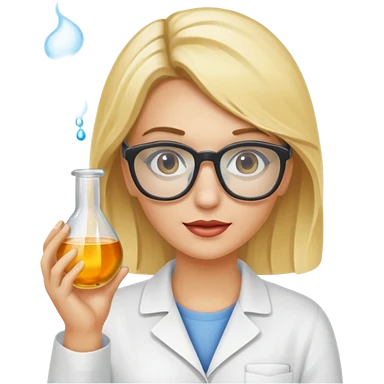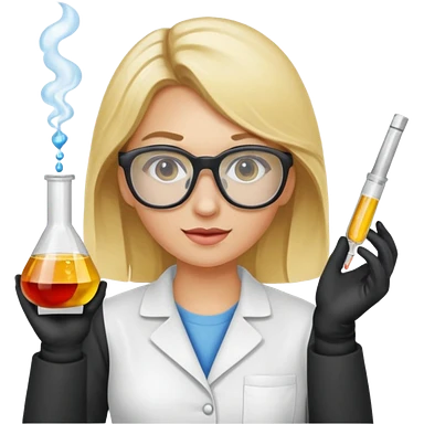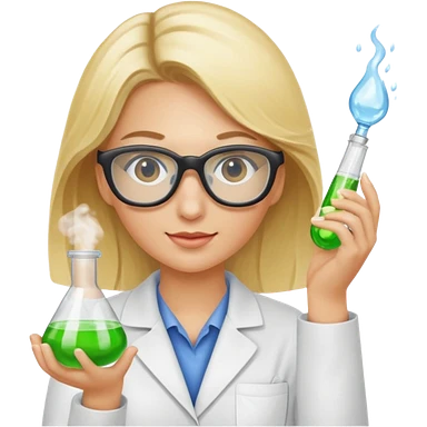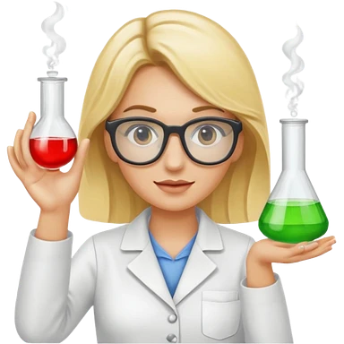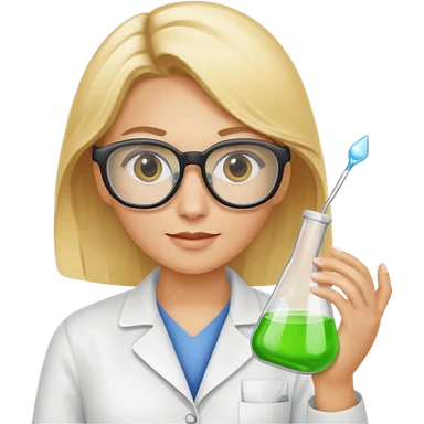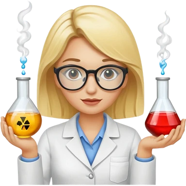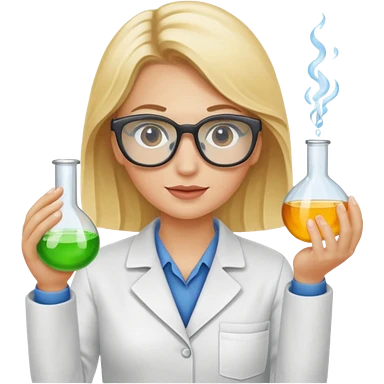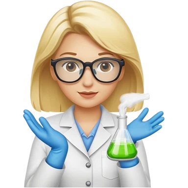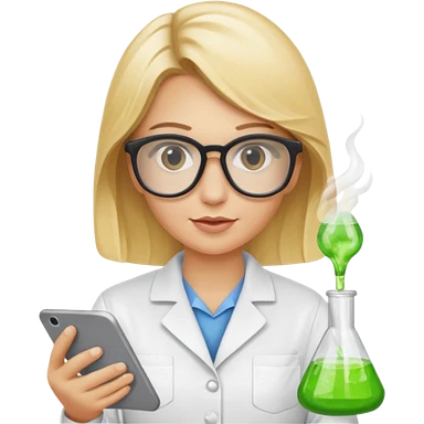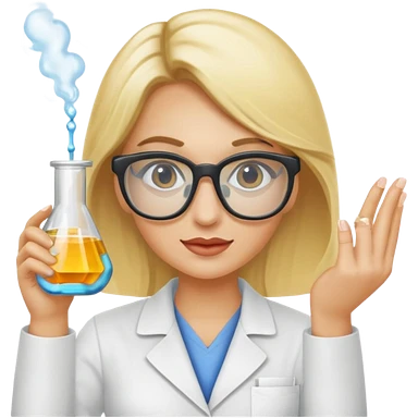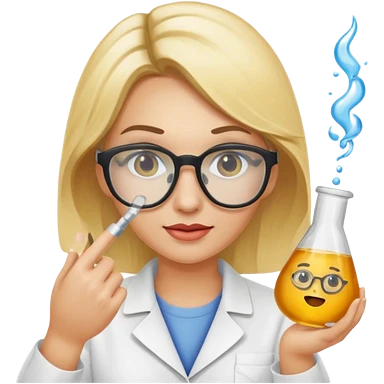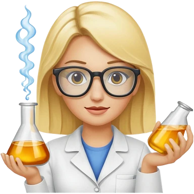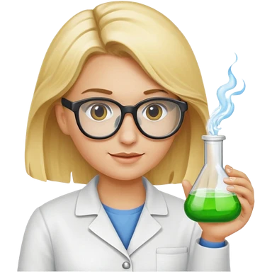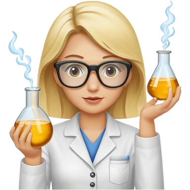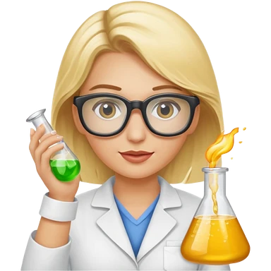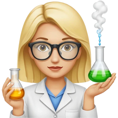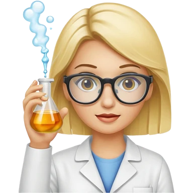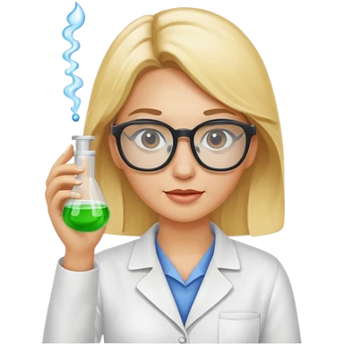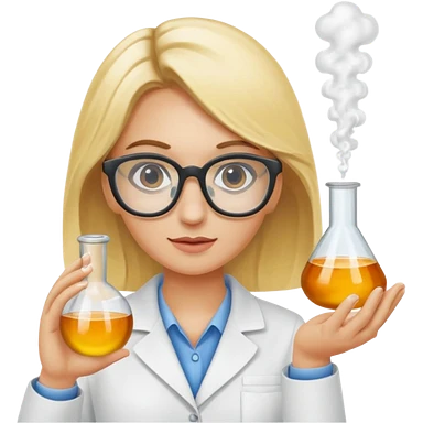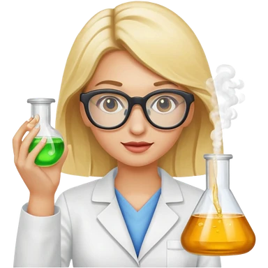 Eine hellblonde Chemikerin mit Kittel, großer Labor-Sicherheitsbrille und typischem Erlmeyerkolben in der Hand emoji