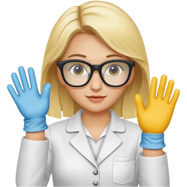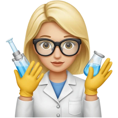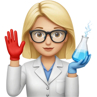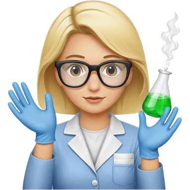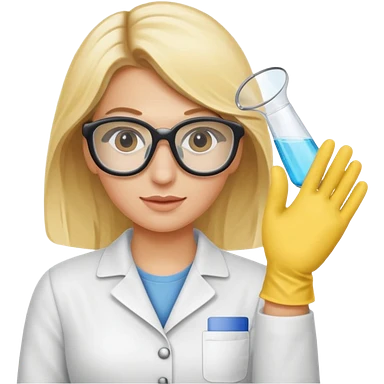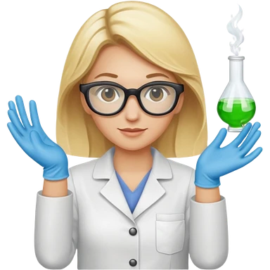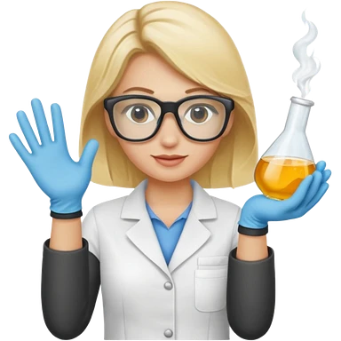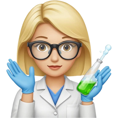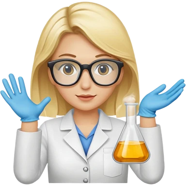 Eine hellblonde Chemikerin mit Kittel, Handschuhen, großer Labor-Sicherheitsbrille und typischem Erlmeyerkolben in der Hand emoji