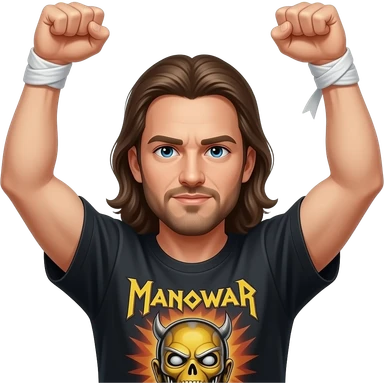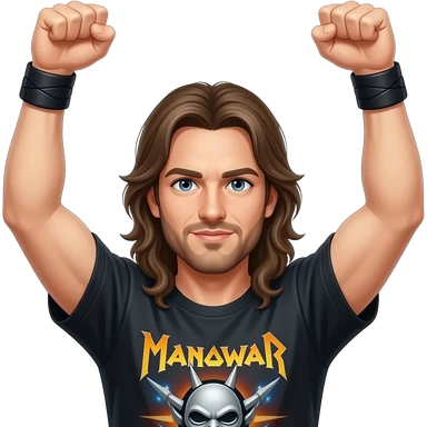 Ein Mann mit langen Haaren und Manowar T-shirt. Die linke Hand ist zur Faust geballt und die rechte Hand umschließt das Handgelenk unter der Faust. Dir Arme sind über den Kopf gereckt emoji