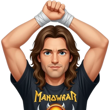 Ein Mann mit langen Haaren und Manowar T-shirt hält beide Arme über den Kopf. Die linke Hand ist zur Faust geballt und die rechte Hand umschließt das Habdgelenk unter der Faust emoji