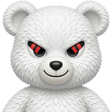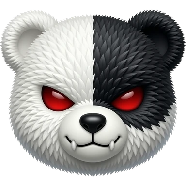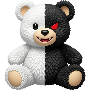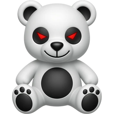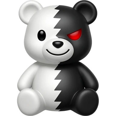 Um Ursinho de pelúcia que tem vida com metade branco é preto branco é normal mas o preto tem um sorriso maligno é olho do formato de / vermelho emoji