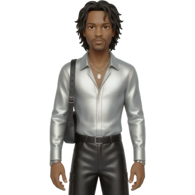 El DeBarge with light tan skin, black long hair, white metallic shirt, black metallic baggy pants, silver necklace emoji