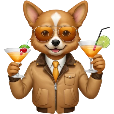 Dog with jacket, holding a cocktail, wearing sunglasses emoji