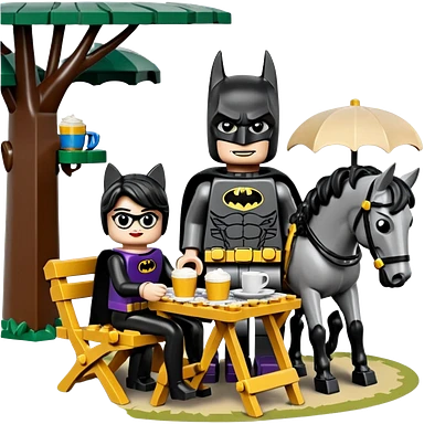 Ultra cute Lego detailed 1854 Batman and pretty Catgirl dream horse drawn Caravan with picnic table and folding chairs alone at romantic afternoon (hot chocolate and cheeseburgers on the grill) emoji