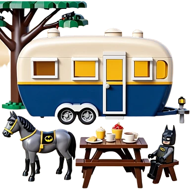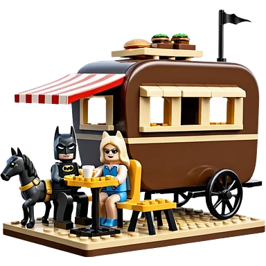 Ultra cute Lego detailed 1854 Batman and pretty Catwoman dream horse drawn Caravan with picnic table and folding chairs alone at romantic afternoon (hot chocolate and cheeseburgers on the grill) emoji