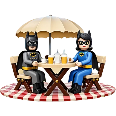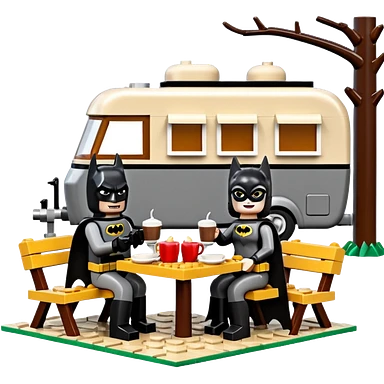 Ultra cute Lego detailed 1854 Batman and pretty Catwoman dream house Caravan with picnic table and folding chairs alone at romantic afternoon (hot chocolate and cheeseburgers on the grill) emoji