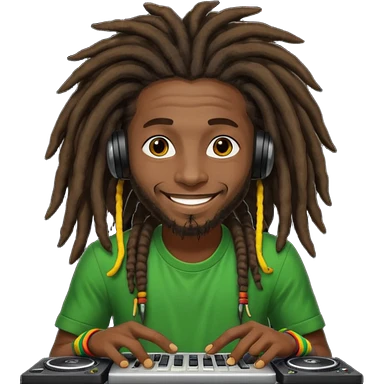 Robot DJ with bright glowing neon pink and neon green lights around turntables, wearing black with neon blue glowing headphones, 8k emoji