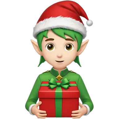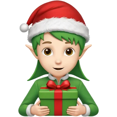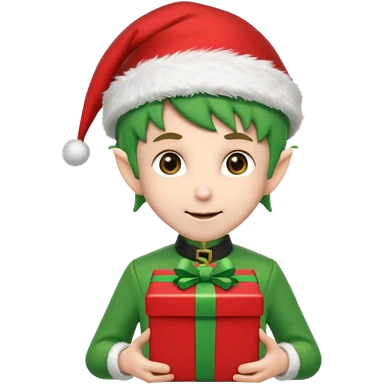 elf wearing a santa hat holidng a xmas present make his unfiorm green adn red emoji