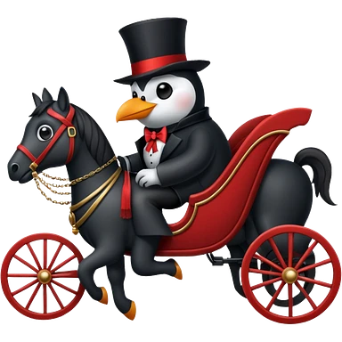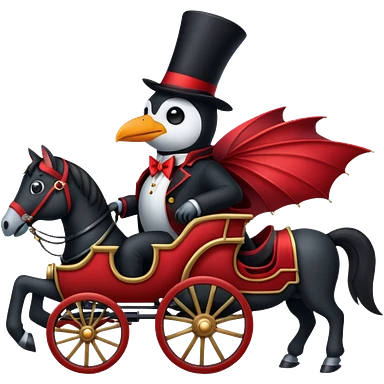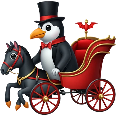 A penguin dressed as dracula riding a 3 horse carriage emoji