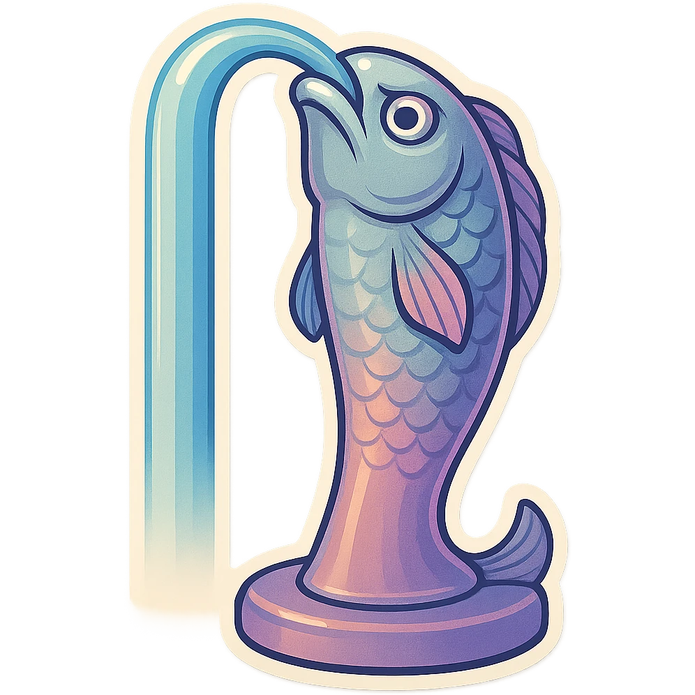 Elongated vertical fountain in the shape of a serious fish with a stream of water flowing from its mouth, detailed drawing with shadows and highlights, thin clean contours, soft rounded shapes, pastel palette #98B5BC, #B5B3C1, #C9A3C9, #E4C0CA, #F7DCD1, #F7C0AA, modern Japanese pop-art style, soft lighting, transparent background, no decoration.emoji