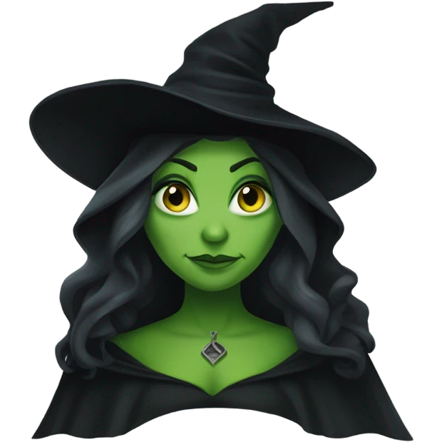 elphaba the wicked witch from wicked movie (cynthia erivo) dark long curly hair, thick lips, wide nose, green skins, witch hat, witch broom, evil, wicked musical film, smirk emoji
