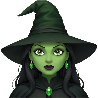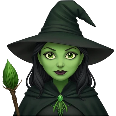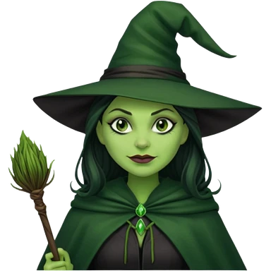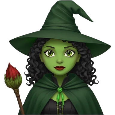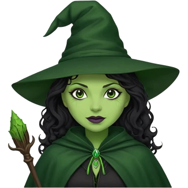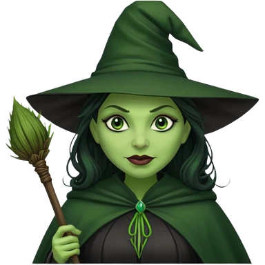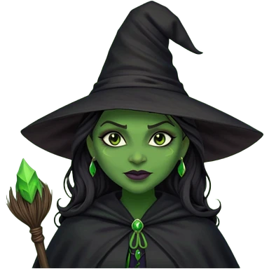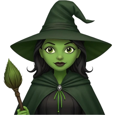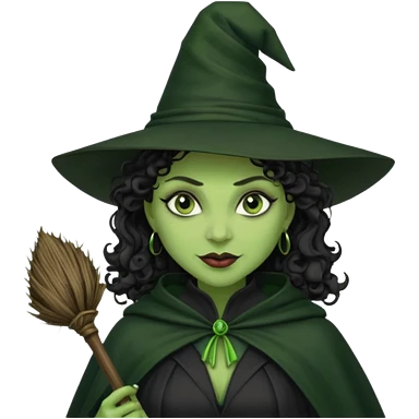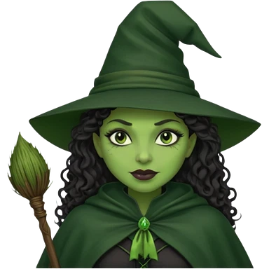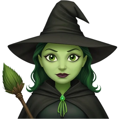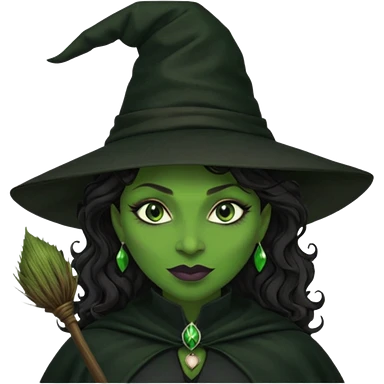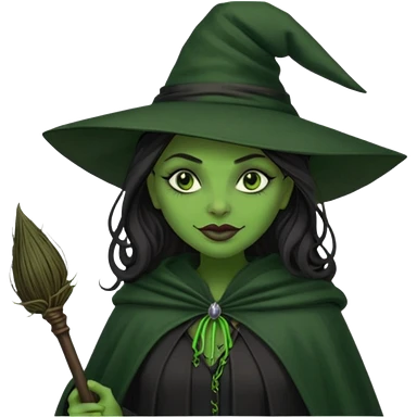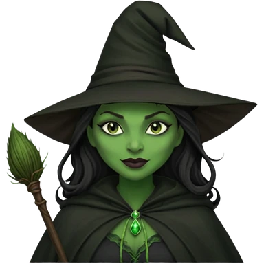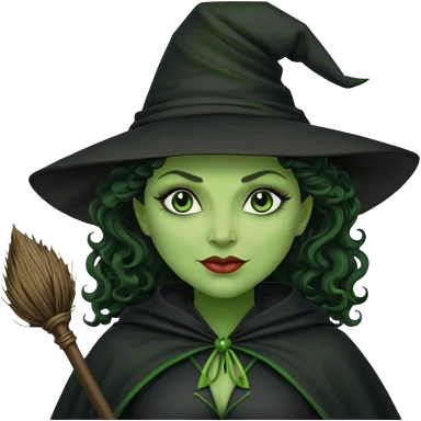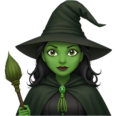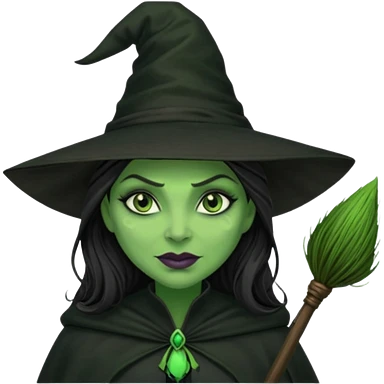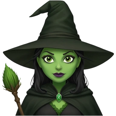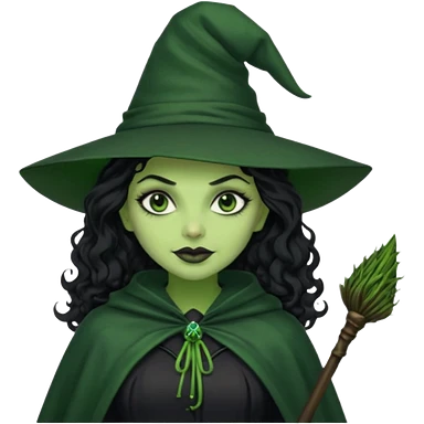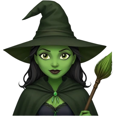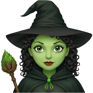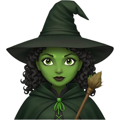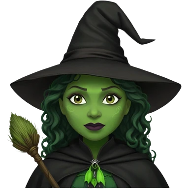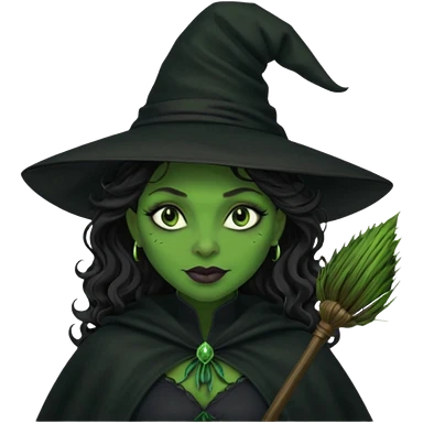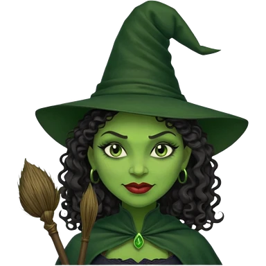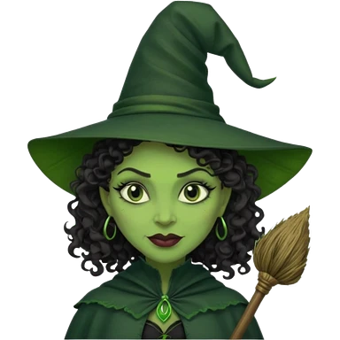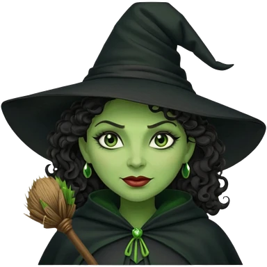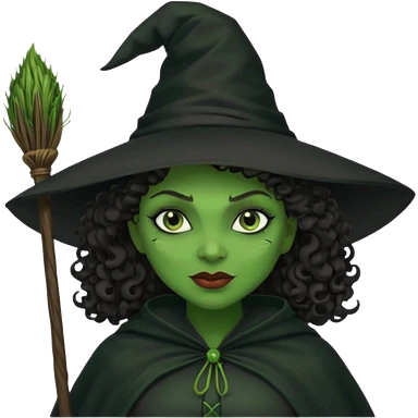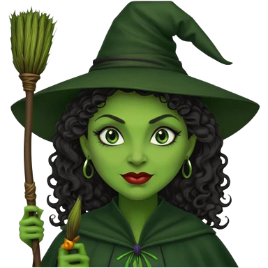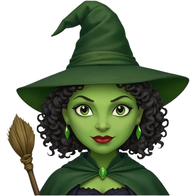 elphaba wicked witch with broom close up, evil dark coily long dark hair, green skin, thick green lips, cheekbones, smirk evil menacing cythia erivo dark aesthetic black hat cloak black broom emoji | AI Emoji Generator
