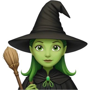 elphaba the wicked witch from wicked movie (cynthia erivo) dark long curly hair, thick lips, green skins, witch hat, witch broom, evil, wicked musical film emoji