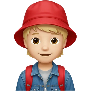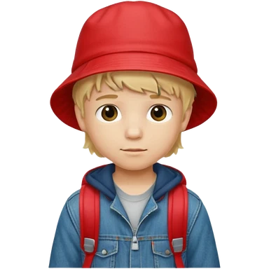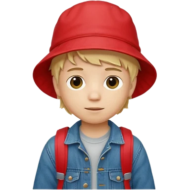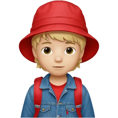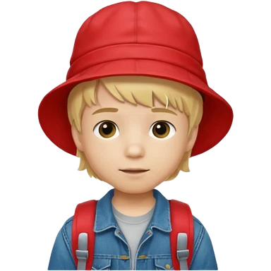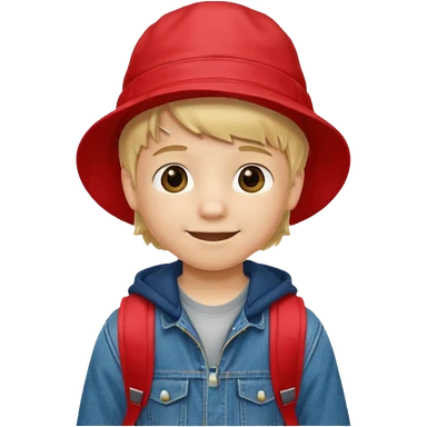 A little boy student, blonde hair, with red bucket hat, jean jacket, backpack emoji