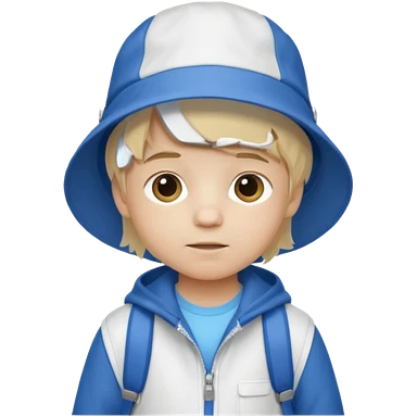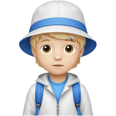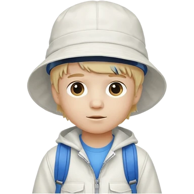 A little boy student white skin, blonde hair, with white bucket hat, white jacket, blue backpack emoji