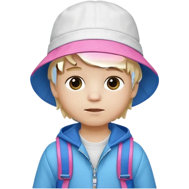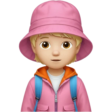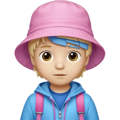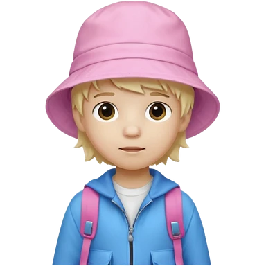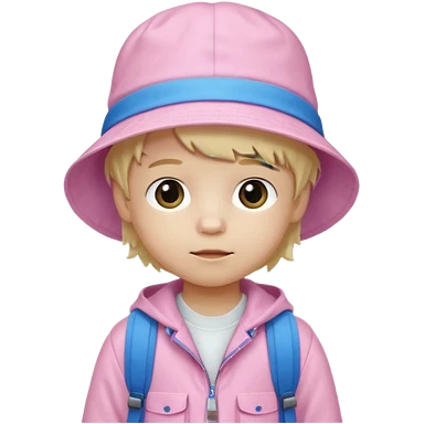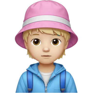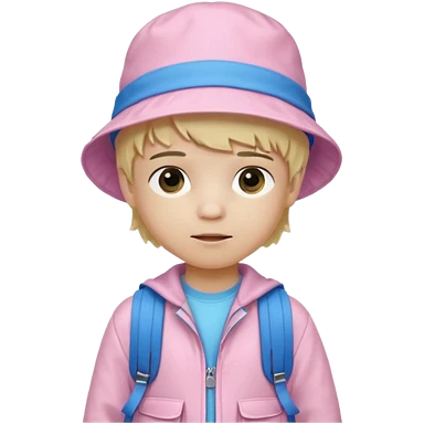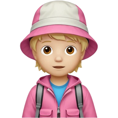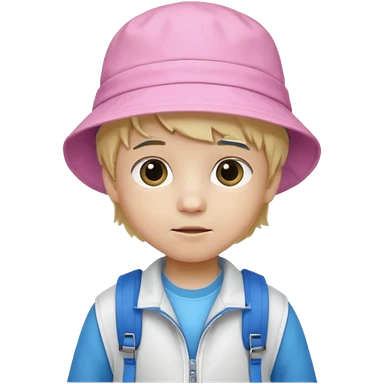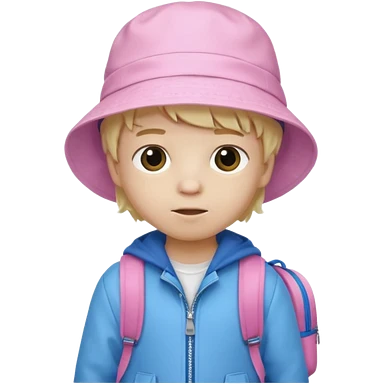 A little boy student white skin, blonde hair, with pink bucket hat, white jacket, blue backpack emoji