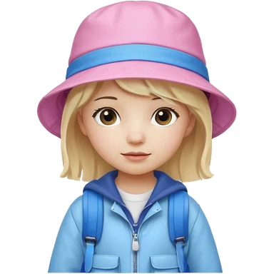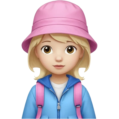 A little girl student white skin, blonde hair, with pink bucket hat, white jacket, blue backpack emoji