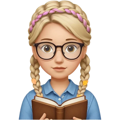 A student, girl, braid hair, wearing glasses, hold book in front of their chest emoji