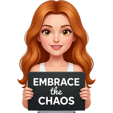 sexy girl with long ginger hair and ginger eyes wearing a white tanktop is holding a black sign with EMBRACE the CHAOS written on it emoji