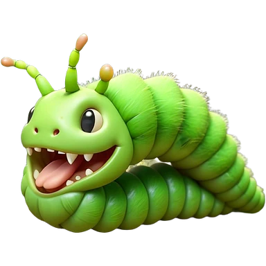 Cinematic Realistic Cute Yawning Caterpillar Portrait Emoji, Head tilted slightly with a dramatic, wide-open yawn, showcasing a soft, downy segmented body in vivid green with subtle drooping and half-closed, drowsy eyes, rendered with intricate natural texture and gentle shadows, high shine, relaxed yet expressive, styled with a dash of woodland charm, soft glowing outline, capturing the essence of a sleepy yet affectionate caterpillar that appears ready to stretch out and rest among the leaves! emoji