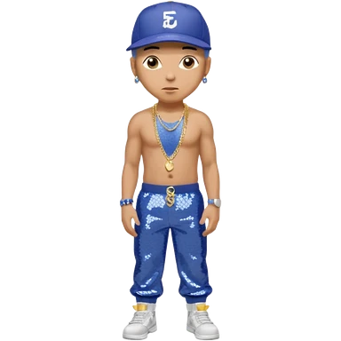 Eminem with periwinkle sequin baggy pants, shirtless with necklace emoji