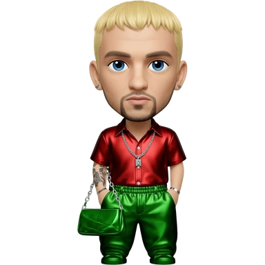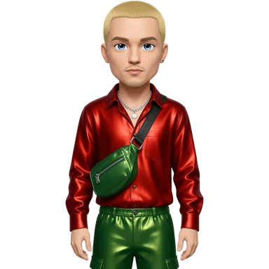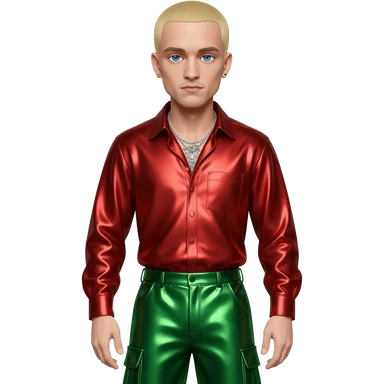 Eminem with blue eyes, blonde short hair, red metallic shirt, green metallic baggy pants, silver necklace emoji