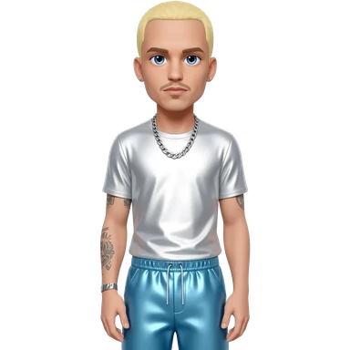 Eminem with blue eyes, blonde short hair, white metallic t-shirt, light grey metallic baggy pants, silver necklace emoji