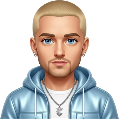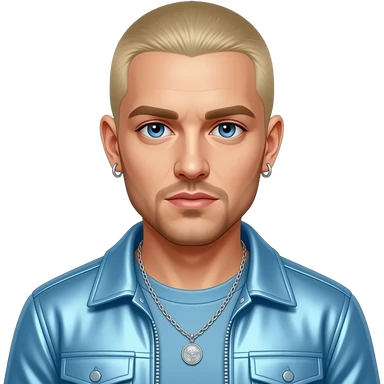 Eminem with blue eyes, blonde buzz cut hair, white metallic shirt, baby blue metallic jacket, necklace and earrings emoji