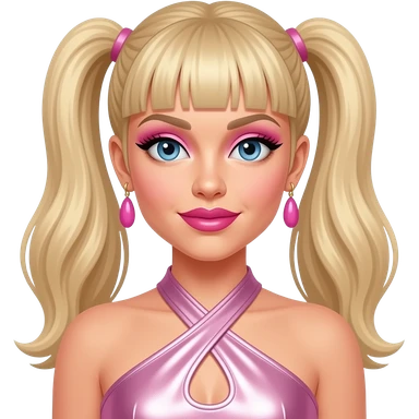 Emma Bunton from Spice Girls with blue eyes, long blonde two high ponytail hair with bang, pink eyeshadow, hot pink lipstick, light pink metallic halter dress, pink earrings emoji