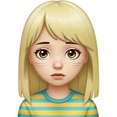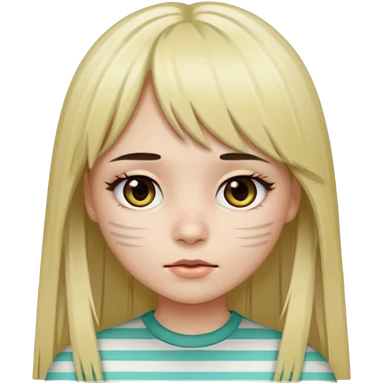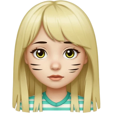 Girl with long straight dark brown hair and blonde striped streaks, with bangs. Light skin and dark eyes. Turn her into a cute zombie version — pale greenish skin, dark eyes, small wounds under eyes, keep her hair and mechas the same, emoji-style. emoji