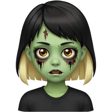 Girl with black hair and raccoon blonde streaks, bangs, light skin, zombie version, pale green skin, emoji style. emoji