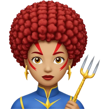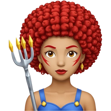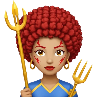 Emoji metisse femboy avec drapeau ukrainien arriere plan, un afro, sourcils rouge, fourche trident, et eclairs emoji