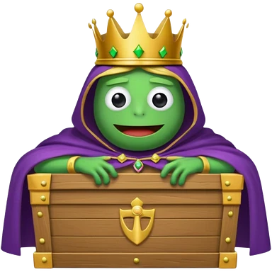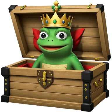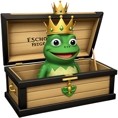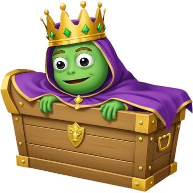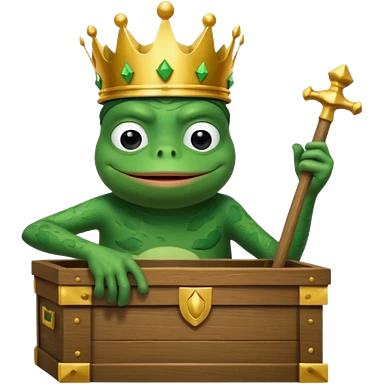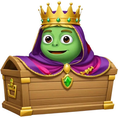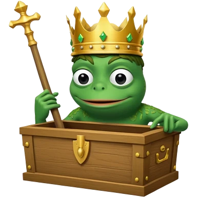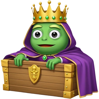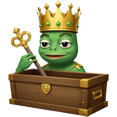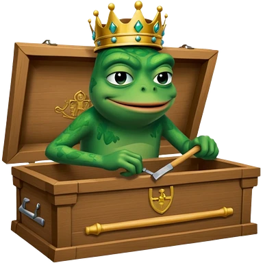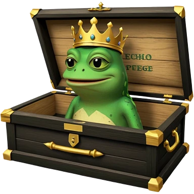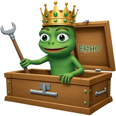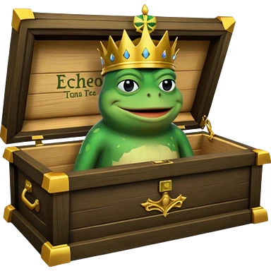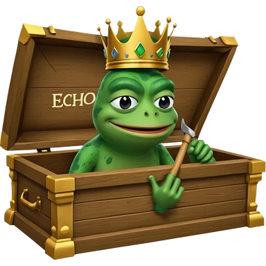 Emoji of an empty wooden coffin with its lid on top, the word ‘ECHO’ carved into the side panel. The coffin is shown from the outside. A king-like Pepe the Frog, standing outside the coffin, is hammering nails into the lid to seal it shut. No character is inside the coffin. Not a treasure chest. emoji