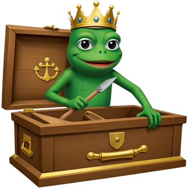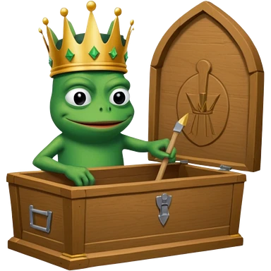 Emoji of an empty wooden coffin with its lid on top, the word ‘ECHO’ carved into the lid. The coffin is shown from the outside. A king-like Pepe the Frog, standing outside the coffin, is hammering nails into the lid to seal it shut. No character is inside the coffin. Not a treasure chest. emoji