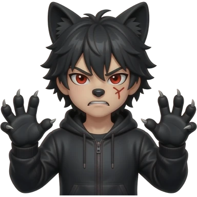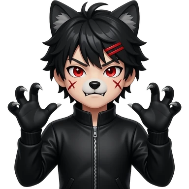 Emo boy with side black fringe with a full buff black alpha furry suit on and red eyes angry with scar wolf man claws uwu hands face wolf emoji