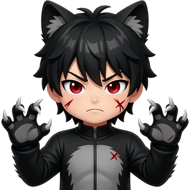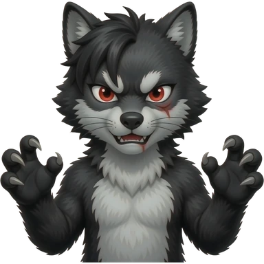 Emo boy with side black fringe with a full buff black alpha furry suit on and red eyes angry with scar wolf man claws emoji