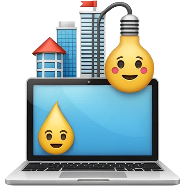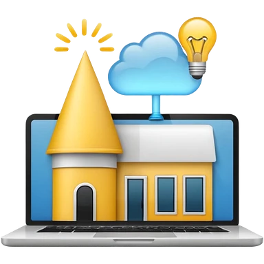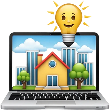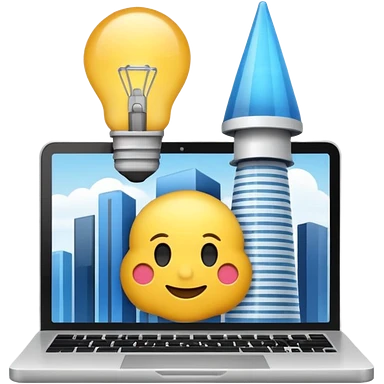 Emoji de una agencia creativa: edificio moderno pequeño con laptop y bombilla de ideas, estilo emoji minimalista, colores planos, líneas limpias, aspecto profesional y amigable, fondo transparente. emoji