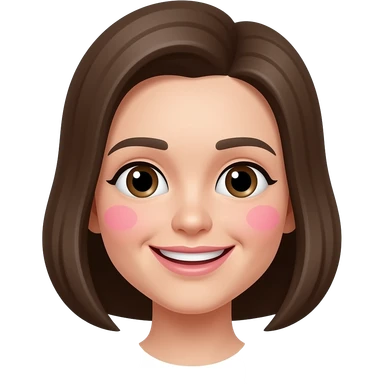 uma mulher com cabelo curto, castanho, levemente ondulados e um pouco abaixo do ombro, sobrancelhas grossas e cílios grandes. Cor da pele é branca e olhos castanhos e um pequeno sinal na bochecha direita. emoji