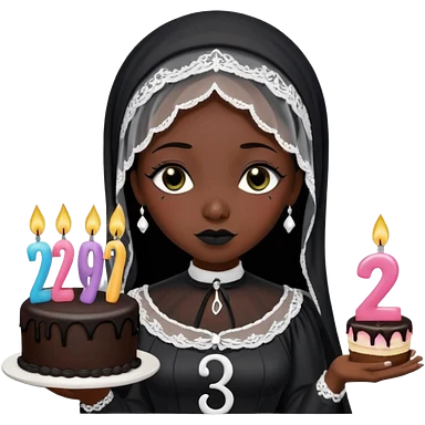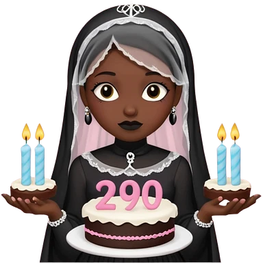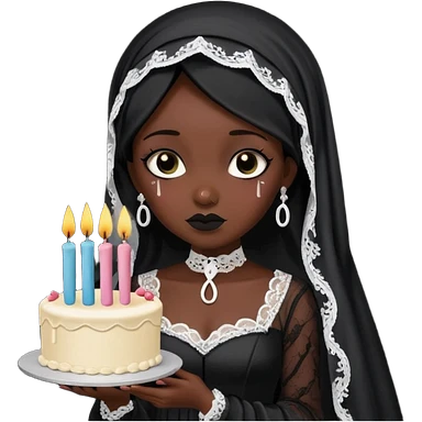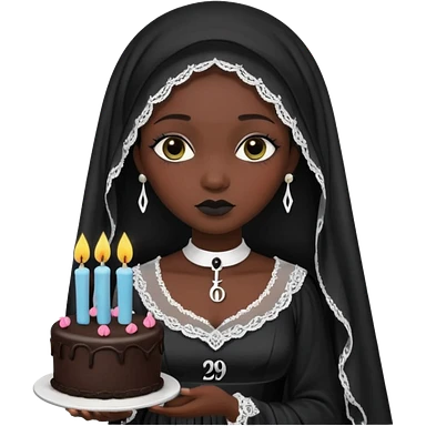 Emoji-style illustration of a cute sarcastic woman, black mourning dress and veil, holding a birthday cake with number 29 candles, ironic expression, RIP 20s theme, flat design, bold outlines, pastel gothic colors, high resolution, clean background, perfect for profile picture emoji