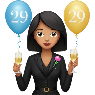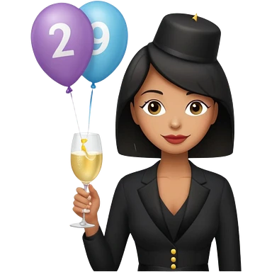 Emoji-style illustration of a funny woman in black funeral outfit holding a prosecco glass, balloon with number 29, ironic birthday funeral theme, playful expression, flat emoji design, pastel tones, high resolution emoji