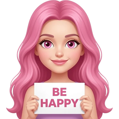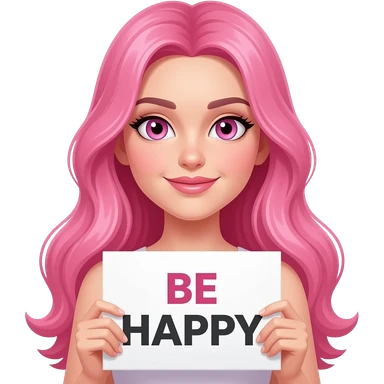 sexy girl with long pink hair and pink eyes holding BE HAPPY sign emoji