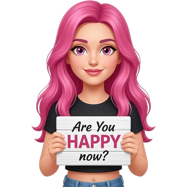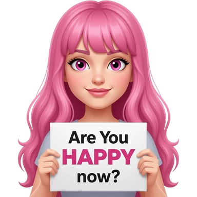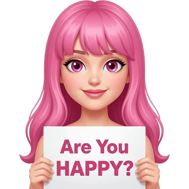 sexy girl with long pink hair and pink eyes holding a Are You HAPPY? sign emoji